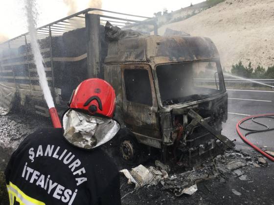 Şanlıurfa otoyolunda alev alan presli kağıt balyaları yüklü tır küle döndü.