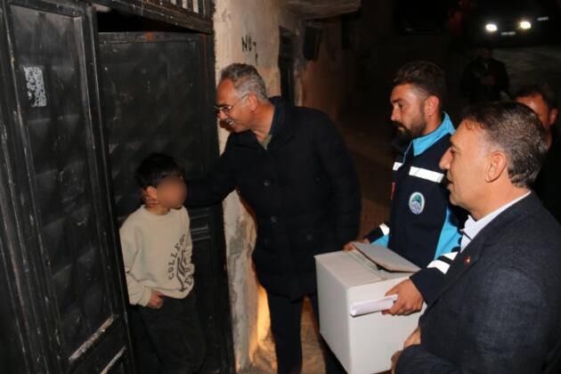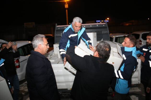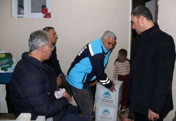 Gıda kolilerini depodan araçlara elleriyle yükleyen Başkan Kuş ve beraberindekiler, gece geç saatlere kadar kapıları tek tek çalarak gıda kolilerini adreslere ulaştırdı.
