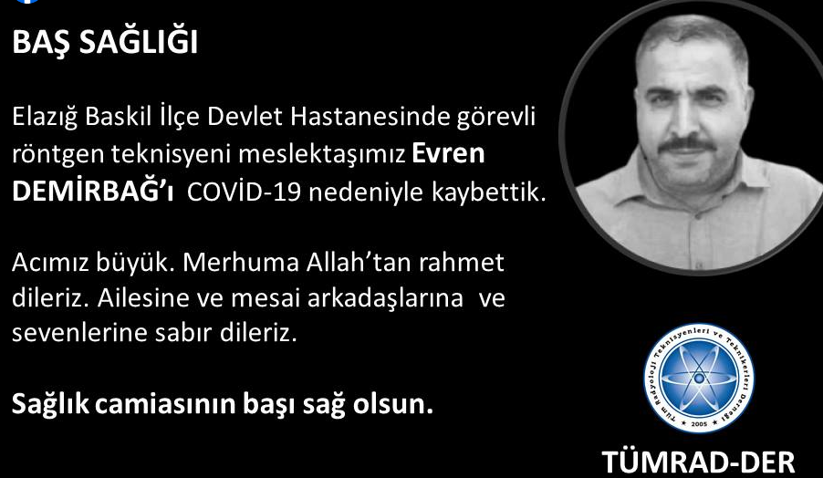 Tüm Radyoloji Teknisyenleri ve Teknikerleri Derneği (TÜMRAD-DER) Başkanı Heybet Aslanoğlu, röntgen teknisyeni Evren Demirbağ’ın COVİD-19 nedeniyle yaşamını yitirdiğini açıkladı.
