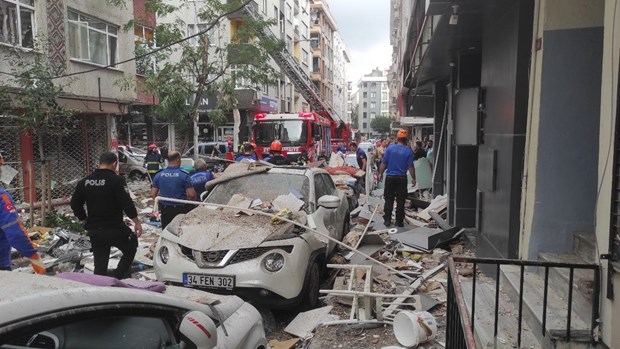 Patlamanın etkisiyle binadan kopan molozlar orada bulunan araçların üstüne düşerken, çevredeki bazı binaların camları da kırıldı.