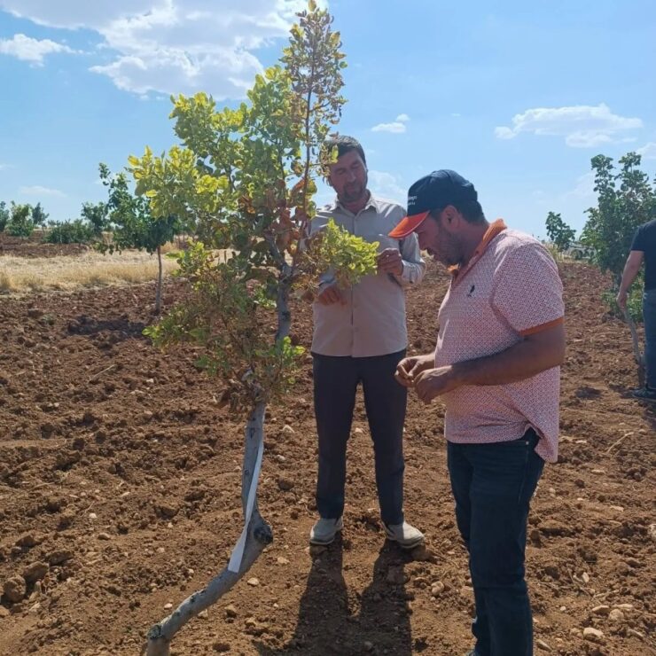 “İlçemiz Maşuk Mahallesi’nde Şakir Almas’a ait yaklaşık 10-12 yaşlarındaki Antep fıstığı bahçesinde yapılan gözlemler ve incelemelerde bitkinin yapraklarında besin elementi eksikliğine bağlı renk değişimlerinin olduğu belirlenmiştir. Üretici hümik asit ve demir tozu kullandığını beyan ettiğinden üreticiye acil olarak sulama ve tapanlı sürüm yapması gerektiği tavsiyesinde bulunulmuştur.