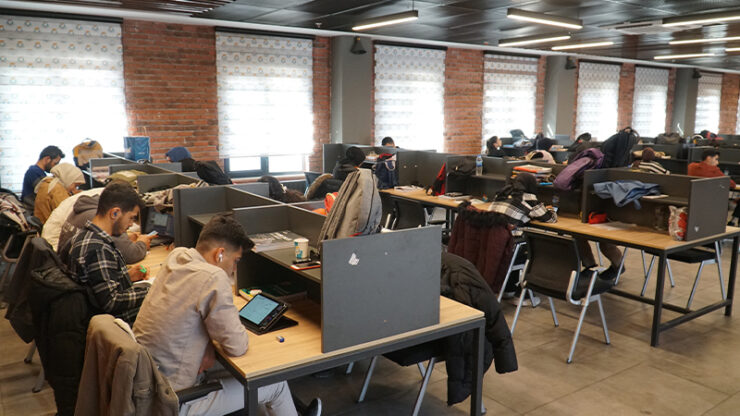 Öğrenciler, İbrahim Tatlıses Kültür Merkezindeki kütüphanede sunulan sessiz ve nezih bir ortamda sınavlara hazırlanıyor.