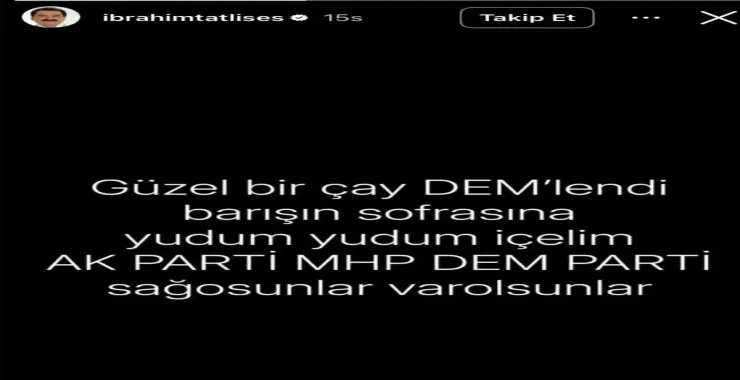Atılan adımlar ve yapılan açıklamaların ardından sanatçı İbrahim Tatlıses de sosyal medya hesabından; “Güzel bir çay DEM’lendi barışın sofrasına yudum yudum içelim. AK Parti, MHP, DEM Parti sağ olsunlar, var olsunlar” mesajını yayımladı.