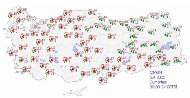 Yağışların genellikle yağmur ve sağanak, güney, iç ve batı kesimlerde yer yer gök gürültü sağanak, Doğu Karadeniz’in iç kesimleri ile Doğu Anadolu’nun kuzeydoğusunun yüksek kesimlerinde karla karışık yağmur ve kar şeklinde görülmesi beklenen yağışların Doğu Anadolu’nun batısı ile Antalya’nın doğusu, Mersin, Adana, Kahramanmaraş, Osmaniye, Hatay kıyıları, Aksaray, Bitlis, Şırnak, Hakkari, Adıyaman ve Siirt çevrelerinde yer yer kuvvetli olması bekleniyor.