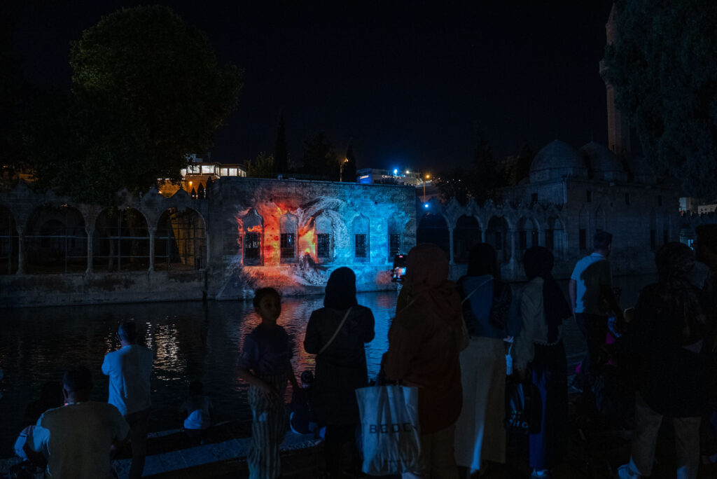 Şanlıurfa Kültür Yolu Festival kapsamında Balıklıgöl’de yer alan Rızvaniye Medresesi’nin duvarına yansıtılan “Işıkla Ateş Arasında” mapping gösterisi yerli halkın yanı sıra şehre gelen turistlerden de yoğun ilgi görüyor.