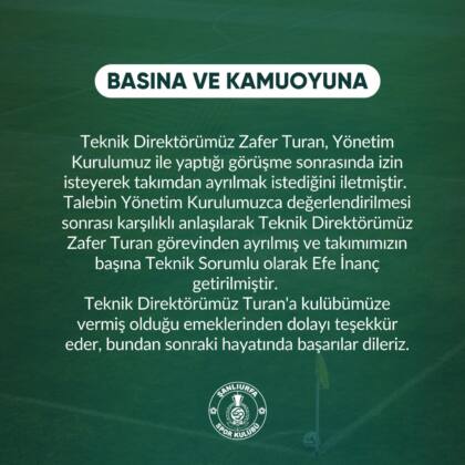 Teknik Direktörümüz Zafer Turan, Yönetim Kurulumuz ile yaptığı görüşme sonrasında izin isteyerek takımdan ayrılmak istediğini iletmiştir.