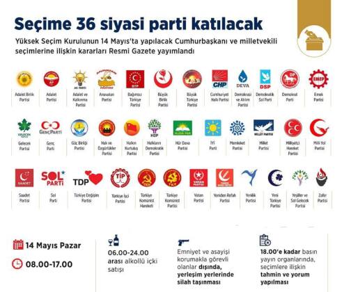 Yüksek Seçim Kurulu, 14 Mayıs’ta yapılacak Cumhurbaşkanı ve 28. Dönem milletvekili seçimlerine 36 siyasi partinin katılmaya hak kazandığını bildirdi.